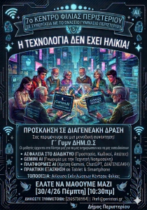 Το 7ο Κέντρο Φιλίας (ΚΕ.ΦΙ.) Δήμου Περιστερίου, σε συνεργασία με το Δημόσιο Ωνάσειο Γυμνάσιο Περιστερίου, διοργανώνει μία μοναδική διαγενεακή δράση με τίτλο «Η Τεχνολογία Δεν Έχει Ηλικία!», που θα πραγματοποιηθεί την Πέμπτη, 30 Απριλίου 2026, στις 10:30 π.μ., στην Αίθουσα Εκδηλώσεων του Κέντρου Φιλίας.