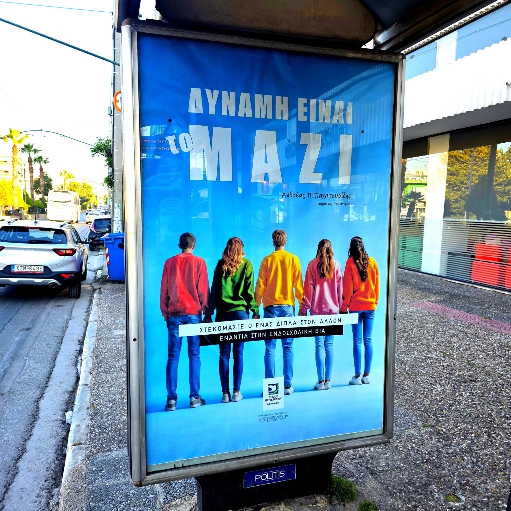Στο πλαίσιο της δράσης «Δύναμη είναι το Μαζί», το μήνυμα κατά του σχολικού εκφοβισμού αναρτάται στις στάσεις των λεωφορείων σε όλη την Αττική, φτάνοντας καθημερινά σε χιλιάδες πολίτες και αγγίζοντας συνειδήσεις και ζωές.